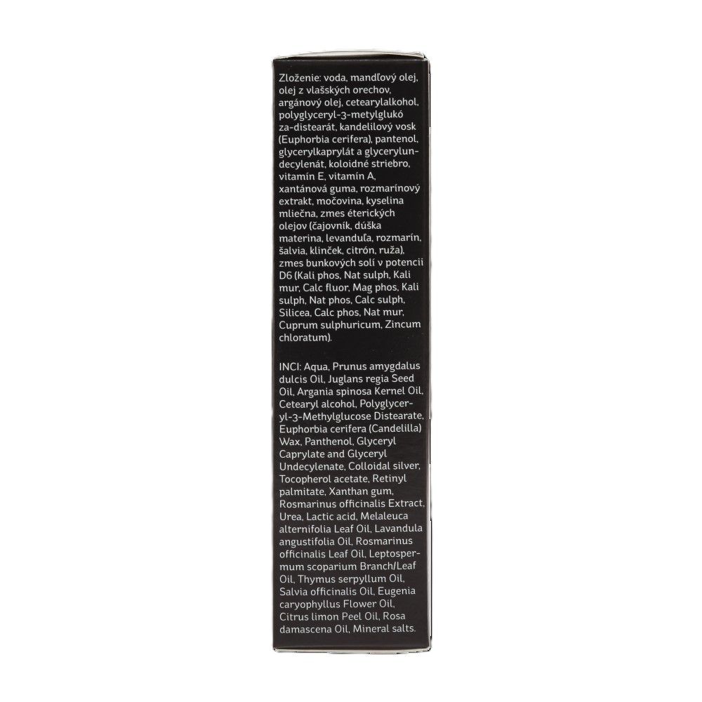 voda, mandľový olej, argánový olej, olej z vlašských orechov, pantenol, kandelilový vosk, vitamín E, vitamín A, rozmarínový extrakt, zmes éterických olejov - čajovník, dúška materina, dúška tymianová, šalvia, levanduľa, rozmarín, klinček, citrón, manuka, ruža, komplex 12 bunkových solí doplnených meďou a zinkom v potencii D6, pomocné látky (cetylstearylalkohol, polyglyceryl-3-metylglukóza distearát, xantánová guma, kyselina mliečna, koloidné striebro)